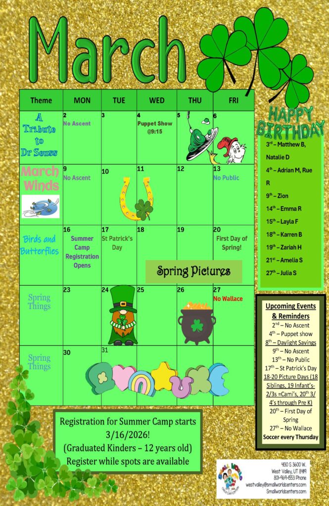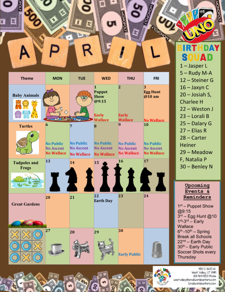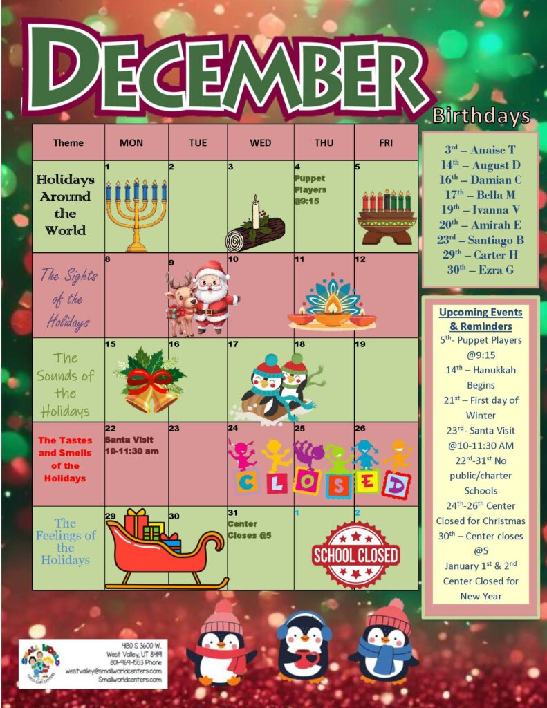 Stay informed about all the fun and engaging activities happening this month at Small World Child Care Centers. Our monthly calendar offers a detailed schedule of daily events, curriculum themes, and special celebrations. From themed weeks to exciting field trips and holiday closures, this calendar ensures you and your child never miss a moment of the action. Whether it’s a new learning experience or a fun-filled day of exploration, every day at Small World is packed with opportunities for growth and joy.