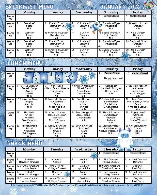 At Small World Child Care Centers, we believe that healthy eating is essential for a child’s growth and development. Our carefully crafted menus provide a variety of nutritious meals and snacks, all prepared fresh daily and approved by the Utah Care About Childcare Food Program. With a five-week rotating menu, your child will enjoy a diverse selection of breakfast, lunch, and snack options that cater to their taste buds while ensuring they receive the essential nutrients they need.